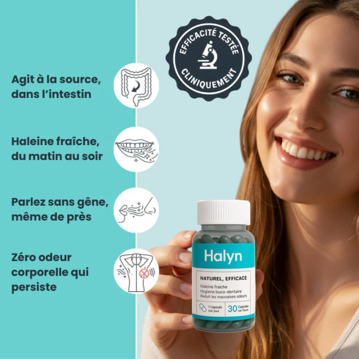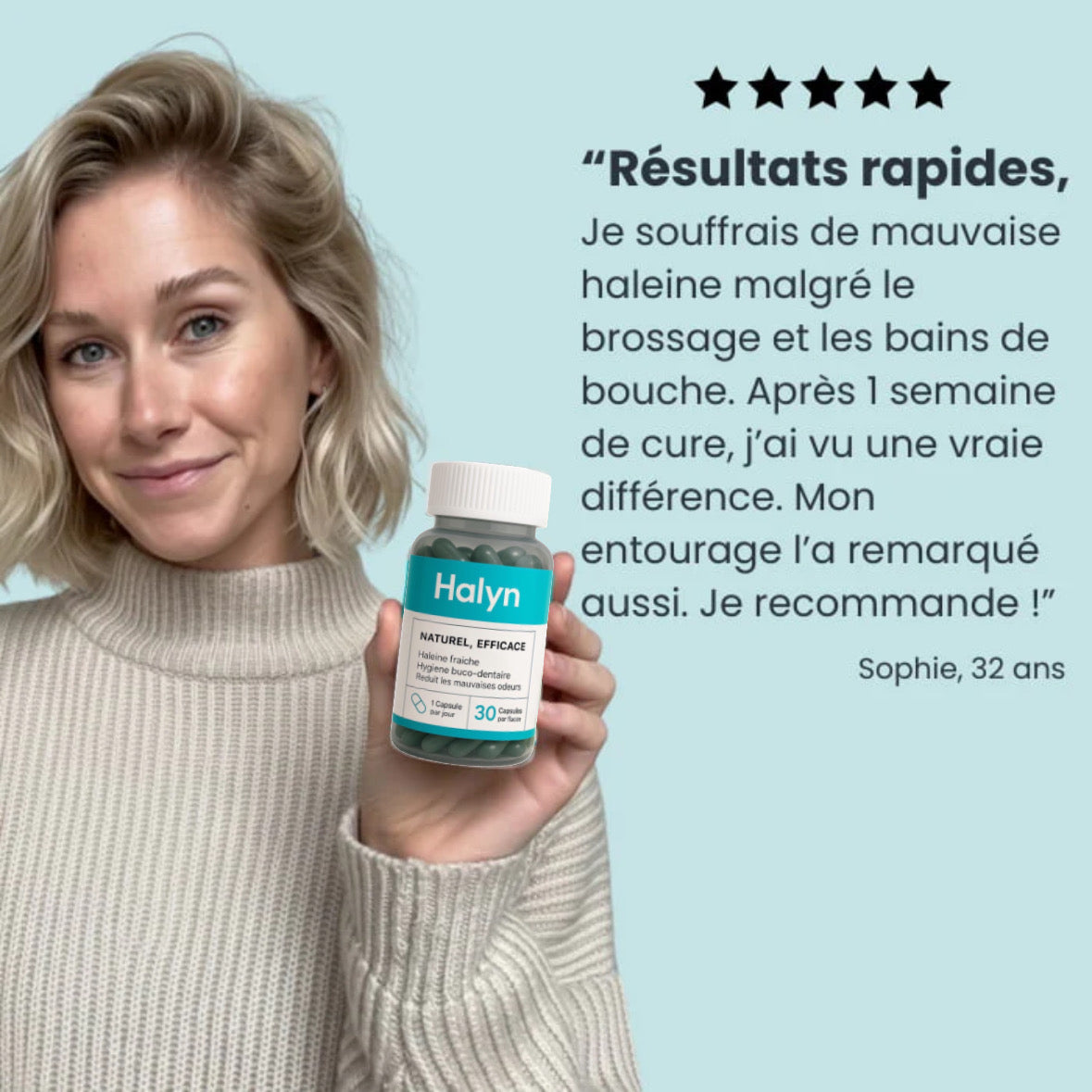 J’étais très complexée par mon haleine malgré une bonne hygiène. Après 2 semaines avec Halyn, plus aucune gêne ! Je revis.